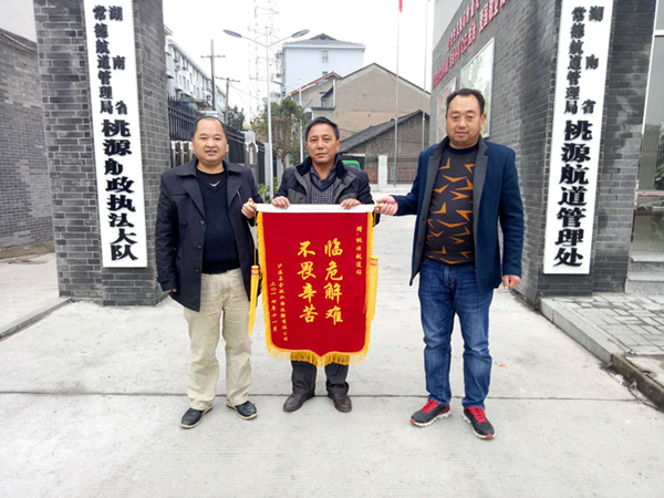 泸溪县金航水路运输有限公司船员(中)向桃源航道处赠送锦旗